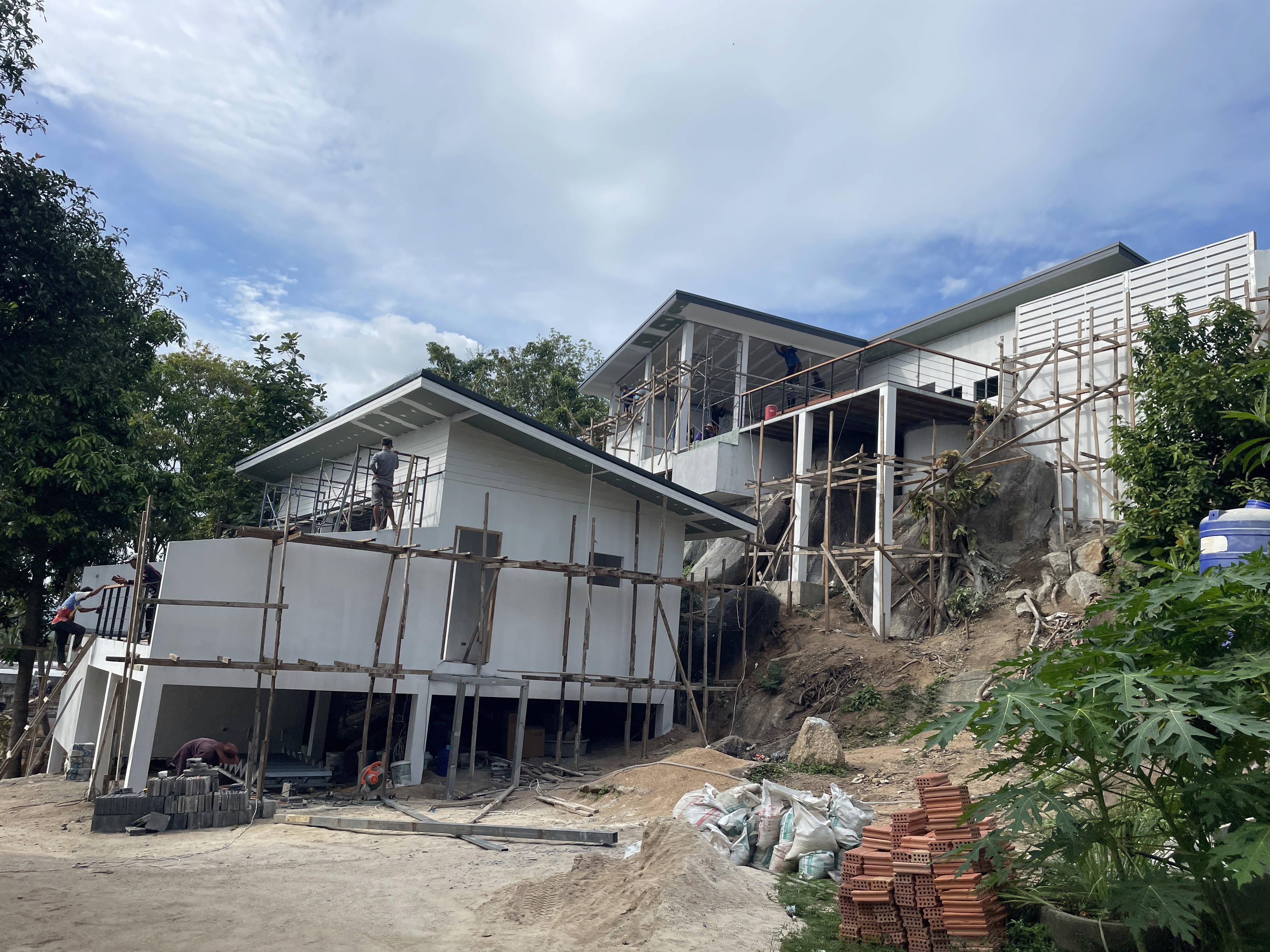 The construction required reinforced structural systems and careful site preparation due to the elevated terrain. High-quality materials and precise construction methods were used to ensure long-term durability and consistent architectural detailing across both villas.